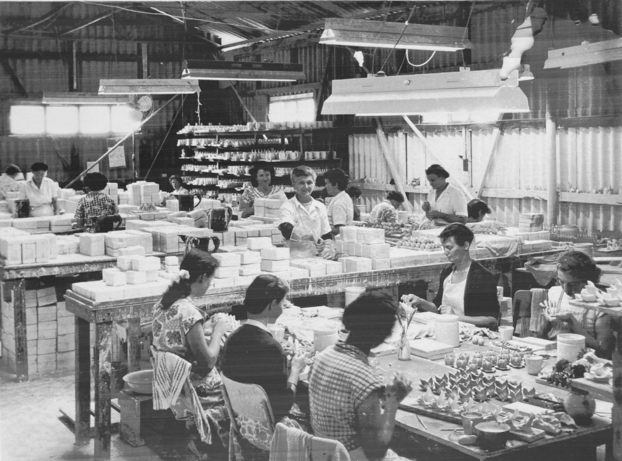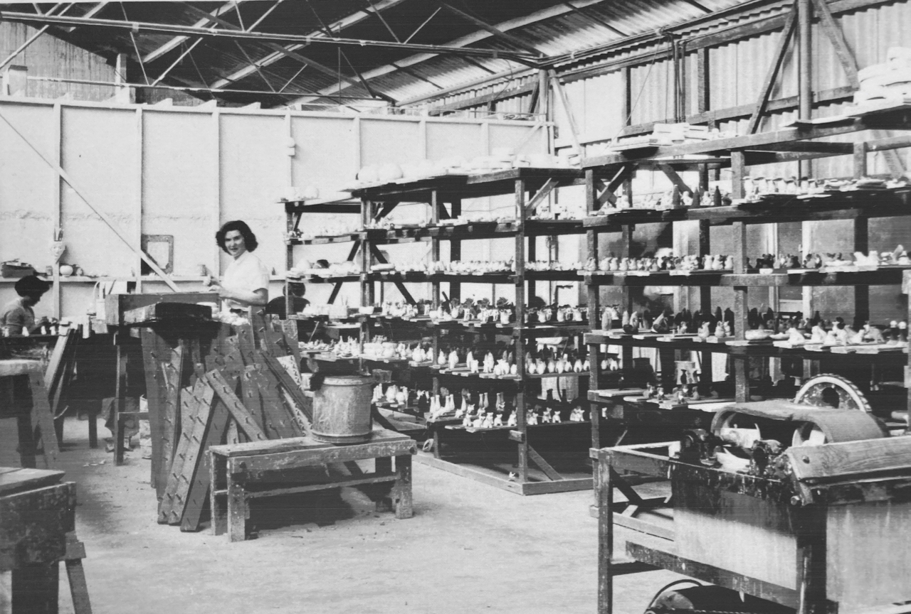 In April 1948 in a tin shed at 108 Wellington St, Perth, Jean and Bill started Darbyshire Ware Pottery with a staff of 3. In 1949 they moved the business to 710 Wellington St, where it grew quickly and they soon employed 22 people, mostly women.