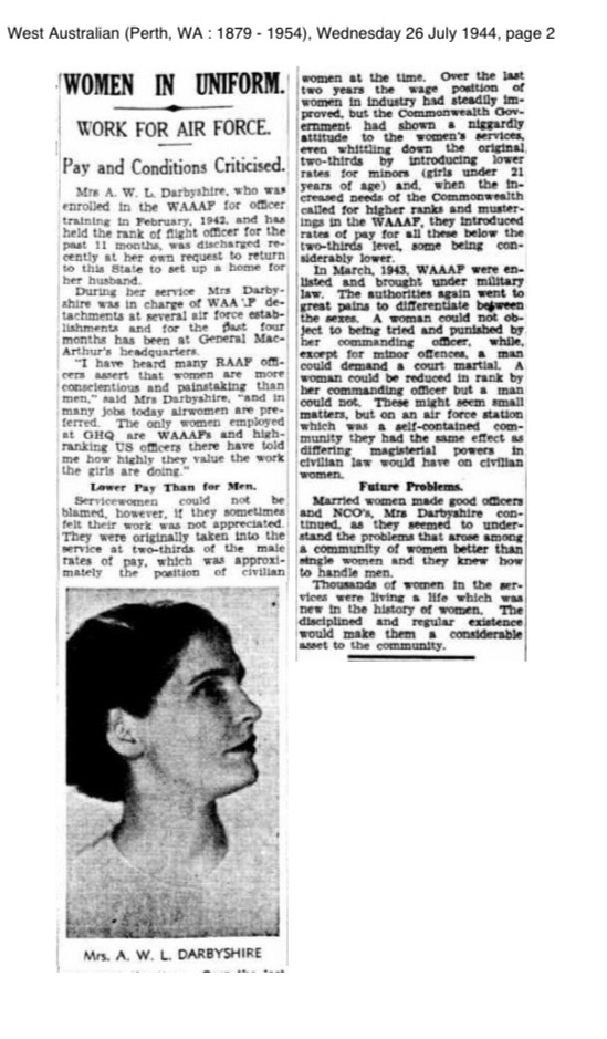 As Flight Lieutenant in charge of WAAAF detachments during WW11, she was interviewed by the West Australian (26 Jul 1944 p 2), on her view of women in the WAAAF. She complained that women’s pay was 2/3rds that of men.
