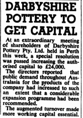 NOTICE IS HEREBY GIVEN that DARBYSHIRE WARE POTTERY PTY. LTD.” has by a Special Resolution of the Company changed its name to “DARBYSHIRE POTTERY PTY. LTD.” 22nd day of April 1954. A. W. L. DARBYSHIRE, The West Australian, 8 May 1954- Page 22.