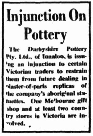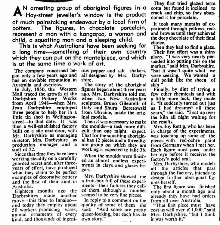 “MODELLER wanted by Darby shire Pottery, qualified applicant will receive high wages or one with natural ability will be trained.” West Australian 13 Nov 1953, p.47