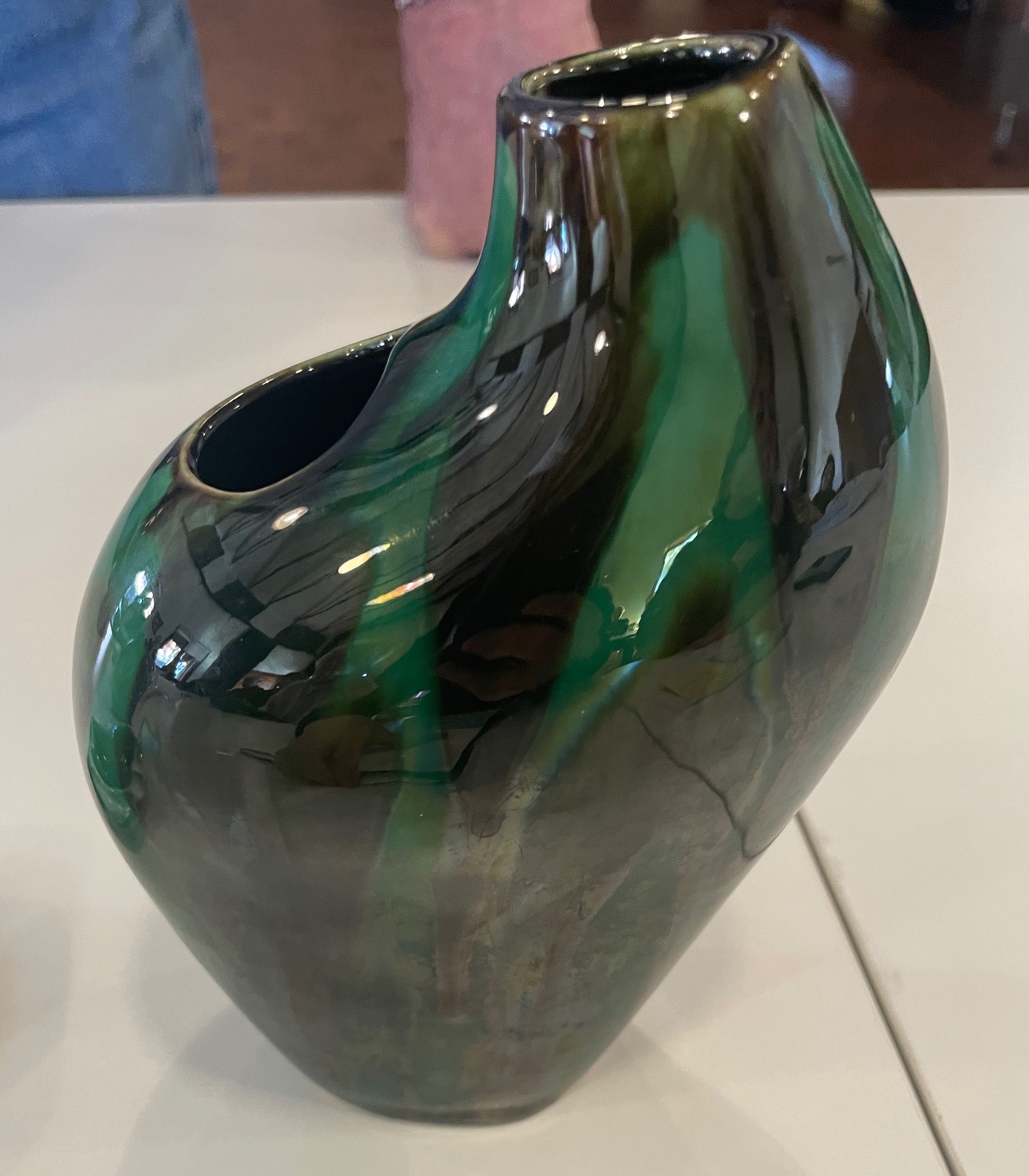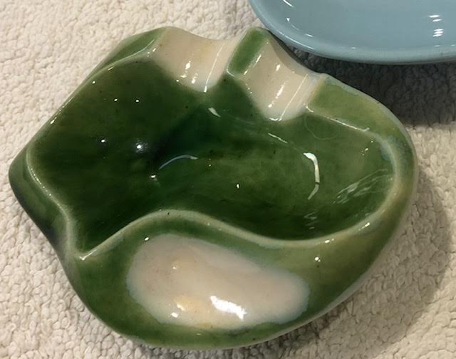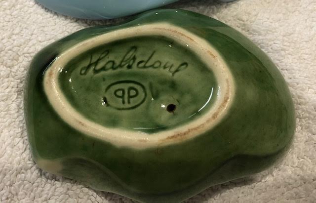 Frank Halsdane was a commercial artist who worked with DP, modeling animals (Shag on a rock is his) and abstract vases. Halsdane continued to produce pieces (ashtrays-see below-with distinctive green glaze) at the factory in 1959, after Jean and Bill left.